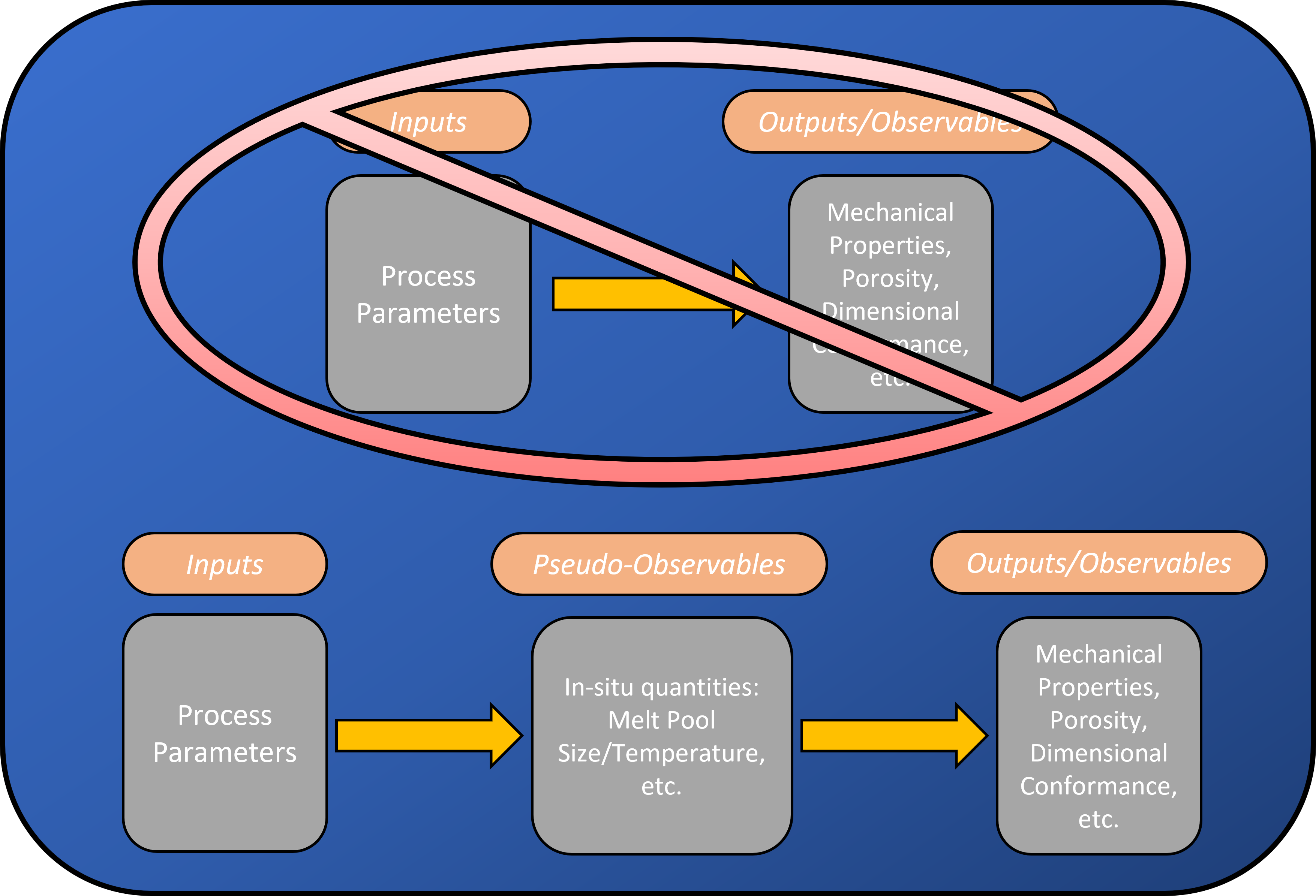 If in-situ monitoring/pseudo-observables has/have value, what, if any, general bounds can be placed on the value of that information? Right now the additive community places sensors which we all believe are pertinent to the process and therefore explicative. Typically it is some combination of optical thermography and tomography sensors that have become the de facto standard sensors, but researchers are still trying more non-conventional sensors. To me this begs the question of what quality of information is required of in-situ monitoring? If no reliable relationship can be formulated from inputs to observables, what sort of distribution is needed as an intermediary so that inputs can describe the pseudo-observable signature and then the pseudo-observables can then reliably describe the observables? In one way this could be analogized as a coordinate transformation, or mapping, and in another way as “learning” the latent space in the case of Generative Adversarial Networks (GANs) [1].